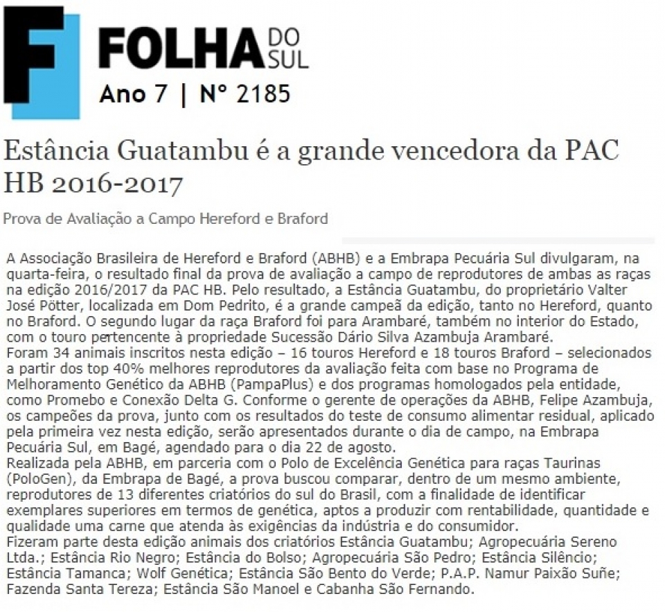 Estância Guatambu é a grande vencedora da PAC HB 2016-2017